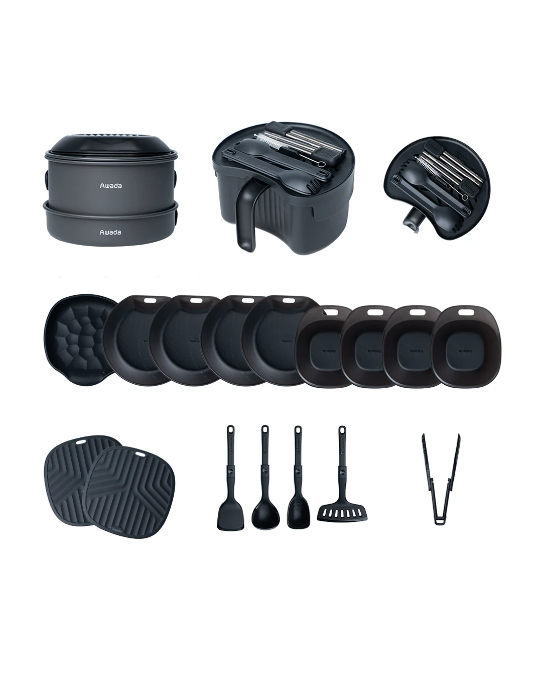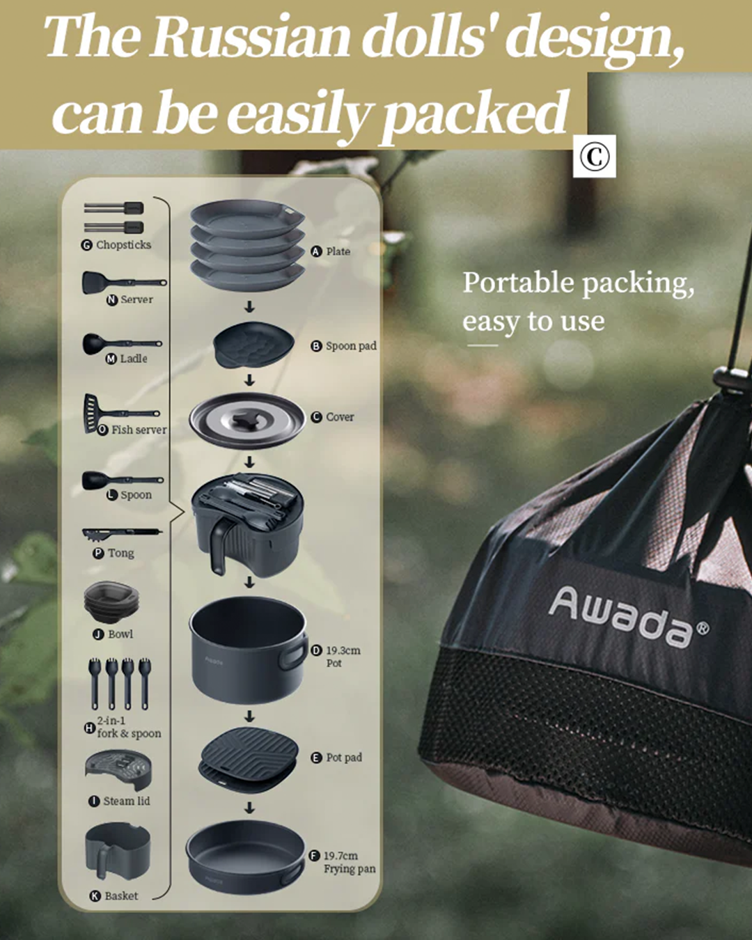 This versatile set offers a convenient solution to your cooking needs with its 25-in-1 stacking storage design, allowing for frying and boiling in a single set. Its non-stick coating ensures easy cleaning with just a simple wipe, providing true non-stick properties for effortless frying. The innovative lid design accommodates various usage scenarios, while the ergonomic design facilitates outdoor cleaning. Ideal for multiple people, this cookware set enhances the relaxation of outdoor gatherings, making it perfect for outdoor parties and adventures.