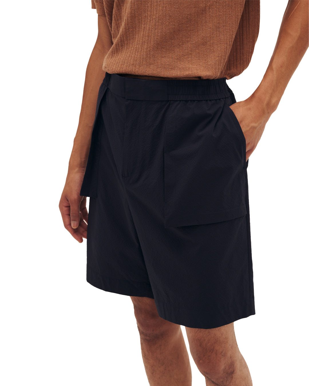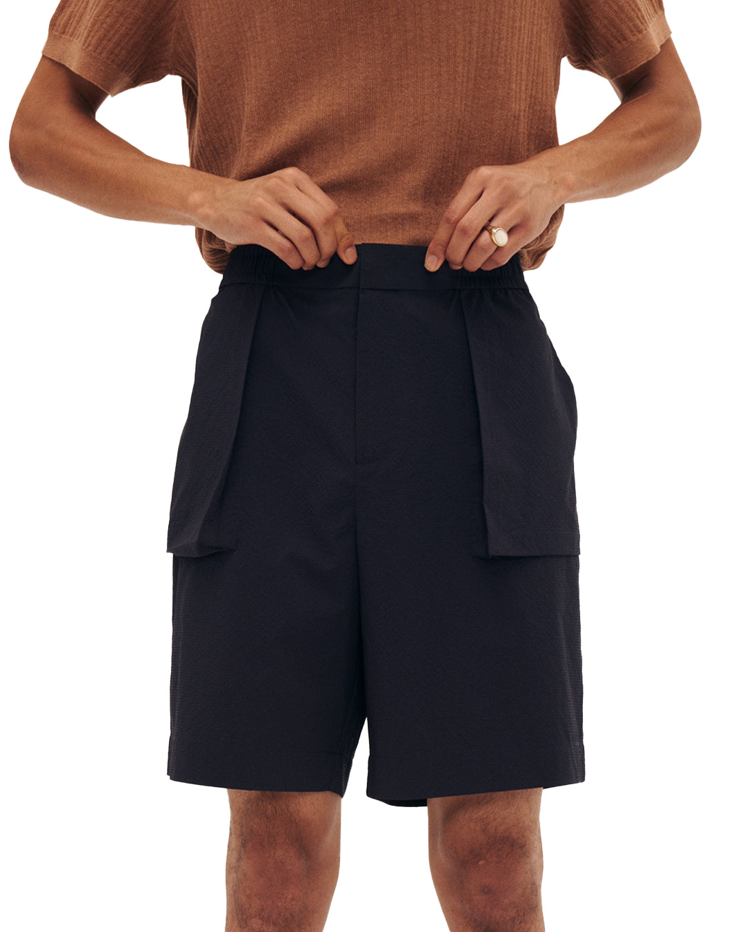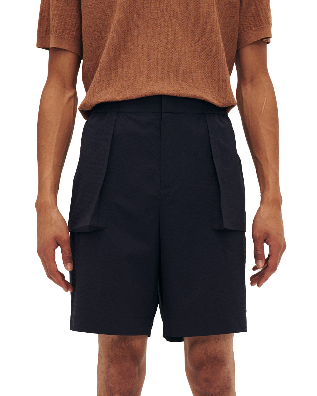 Navy pinstripe seersucker shorts. Cut from functional SOLOTAX Japanese recycled polyamide blend with a slightly pleated effect. The shorts have an elastic waistband at the back with raw edge finishing and front seams. Dual front three-dimensional pockets and side back pockets.