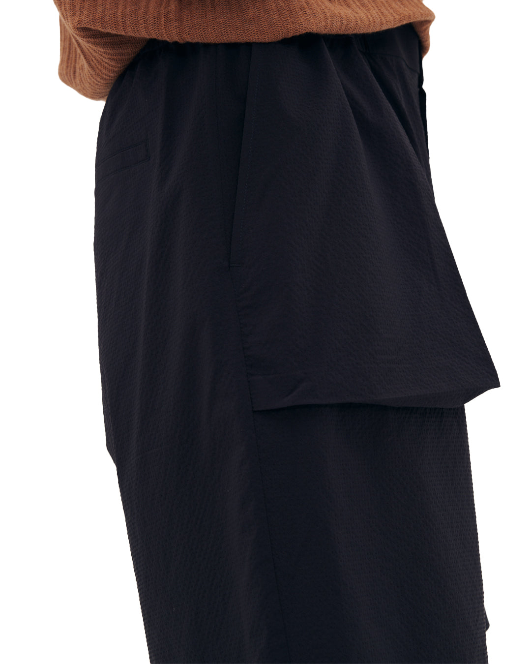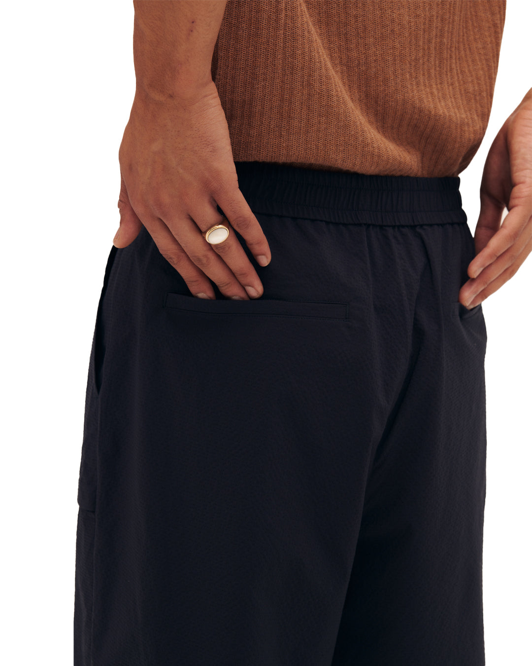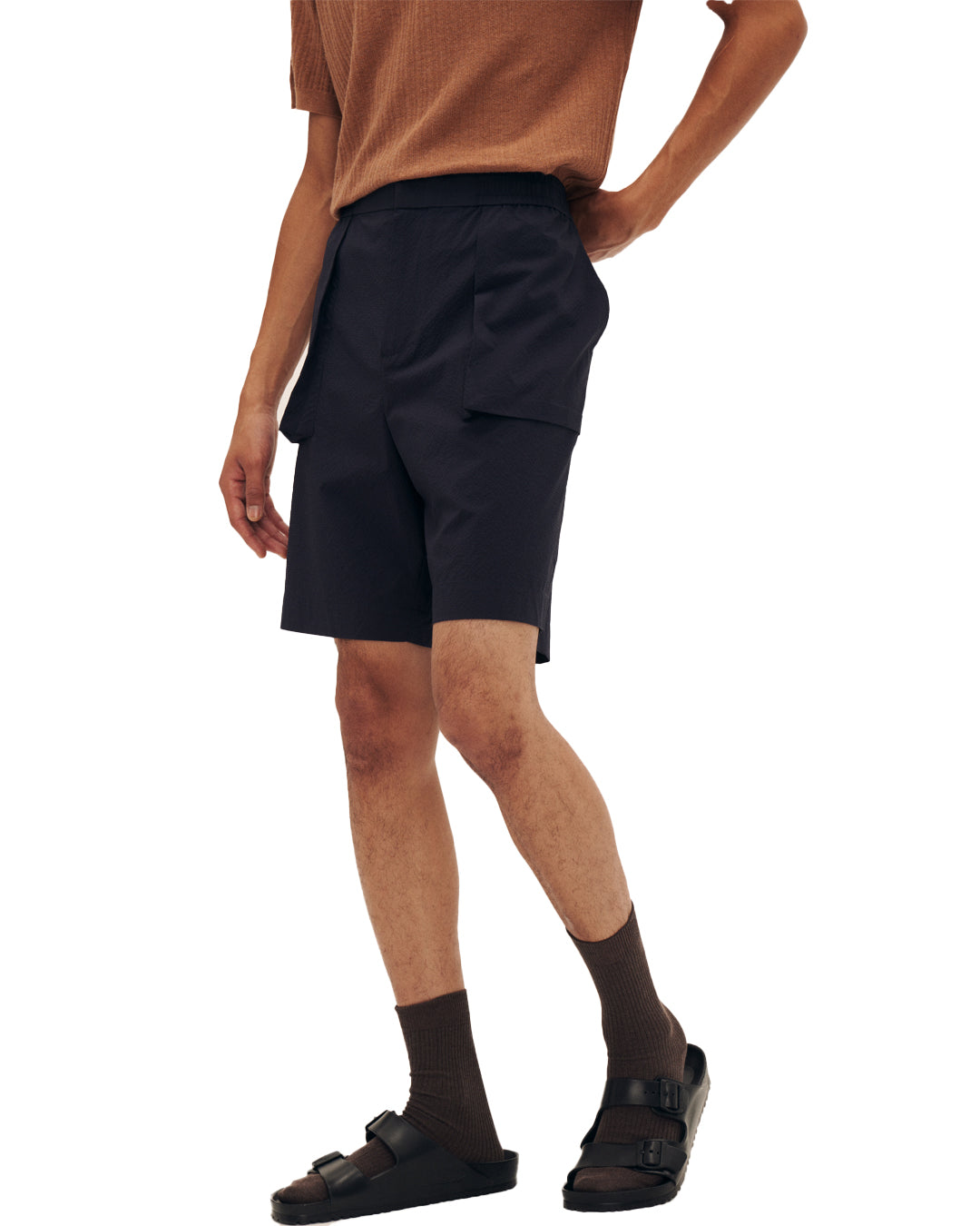 Navy pinstripe seersucker shorts. Cut from functional SOLOTAX Japanese recycled polyamide blend with a slightly pleated effect. The shorts have an elastic waistband at the back with raw edge finishing and front seams. Dual front three-dimensional pockets and side back pockets.