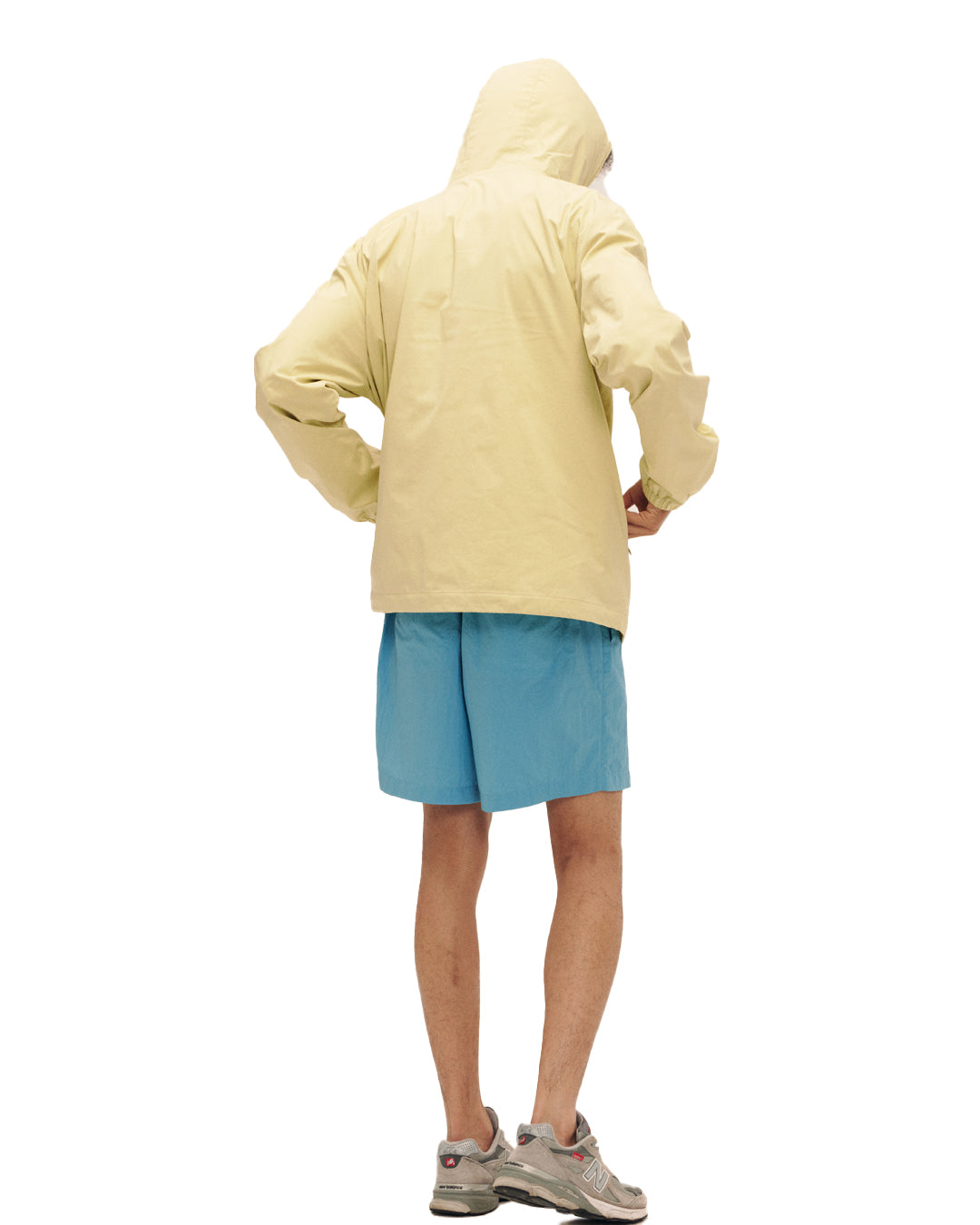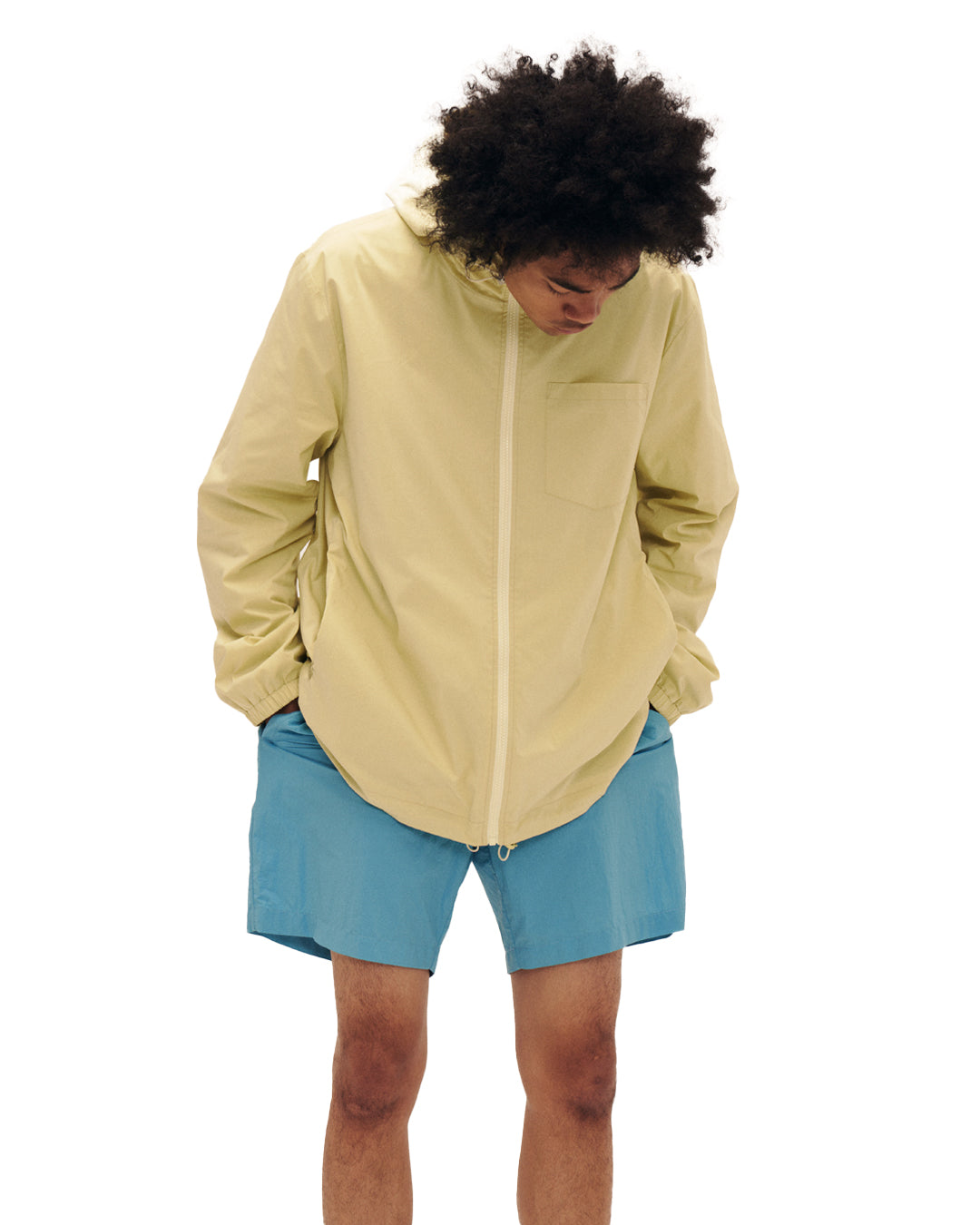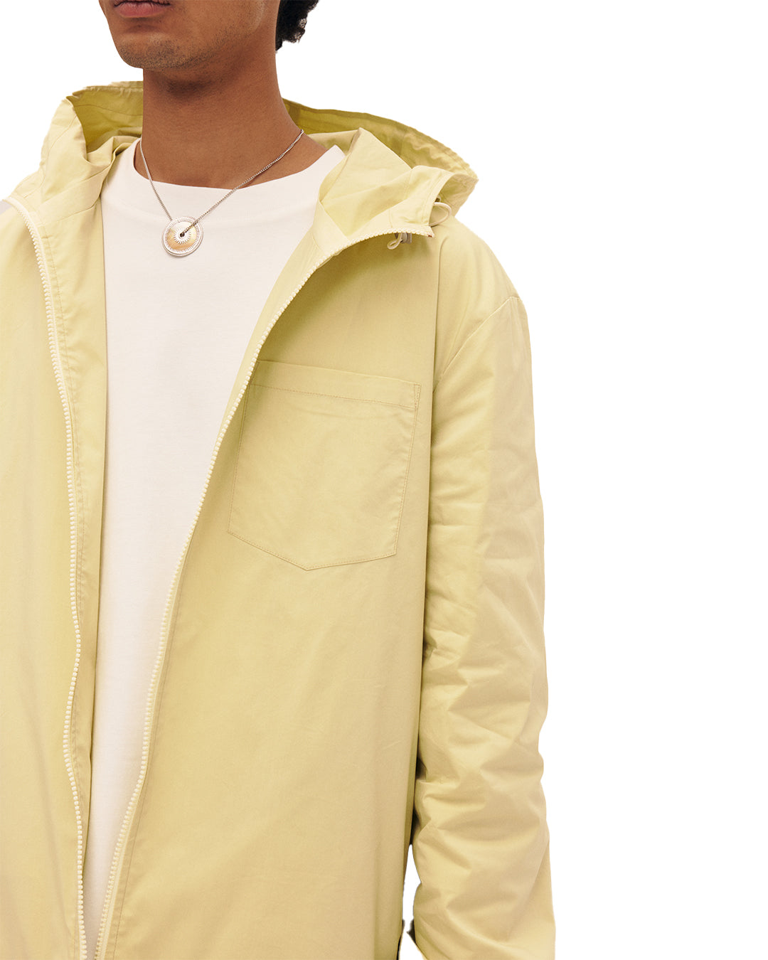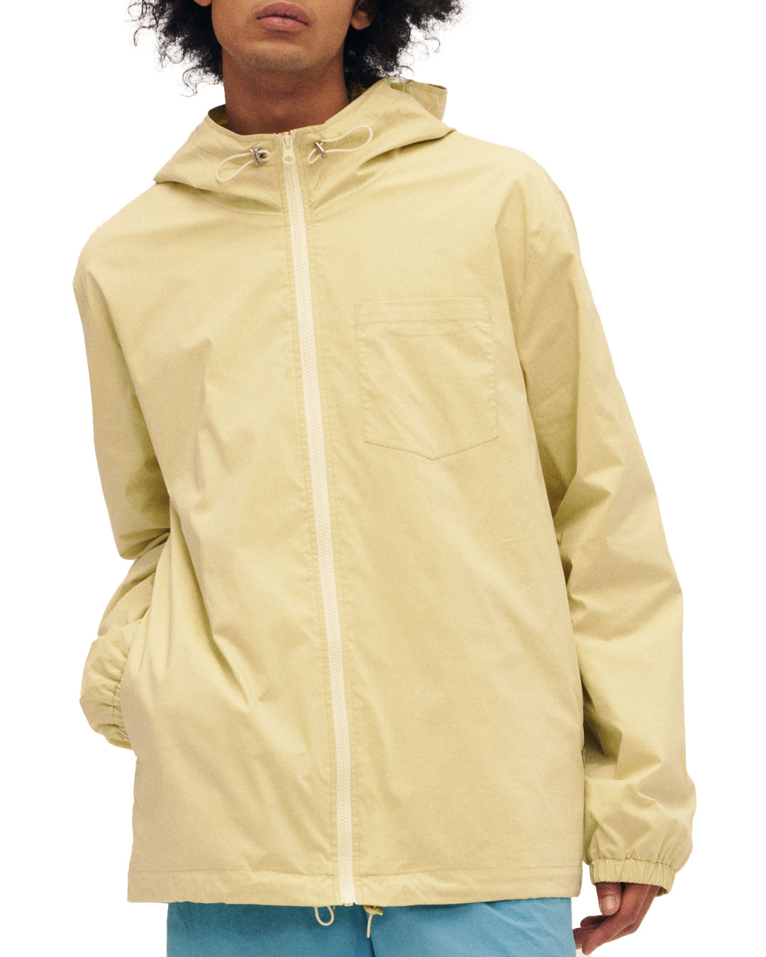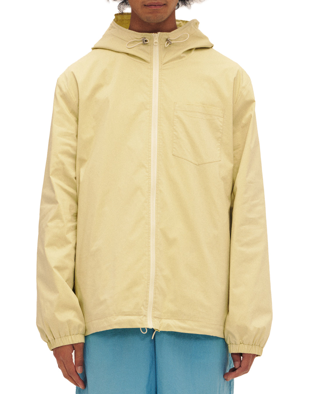 Made from recycled nylon and features a solid onion drawstring hood with a wind-resistant brim. Hidden zippered side pockets on both sides, a chest pocket on the front for easy storage of items, and a straight hem.