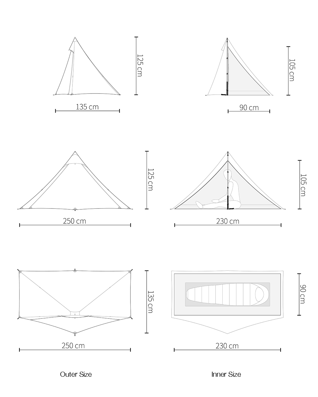 - Rainfly Size: Length: 250cm (98.4 inches); Width: 135cm (53.1 inches); Height: 125cm (49.2 inches)