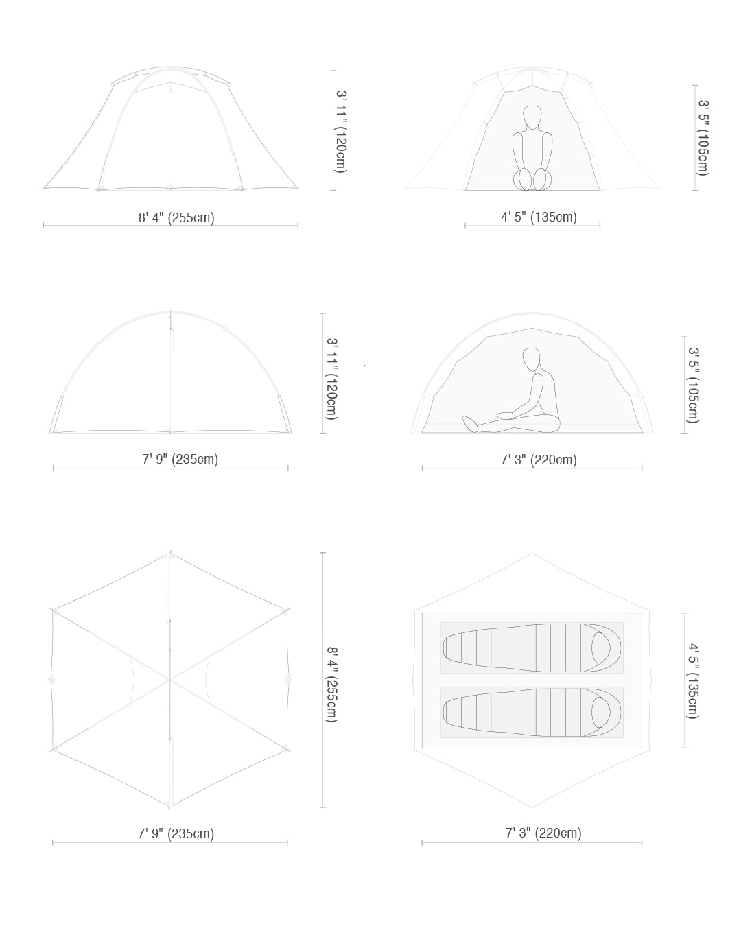 - Rainfly Size: Length: 7’9” (235cm); Width: 7’9” (145cm); Height: 4’0” (120cm)