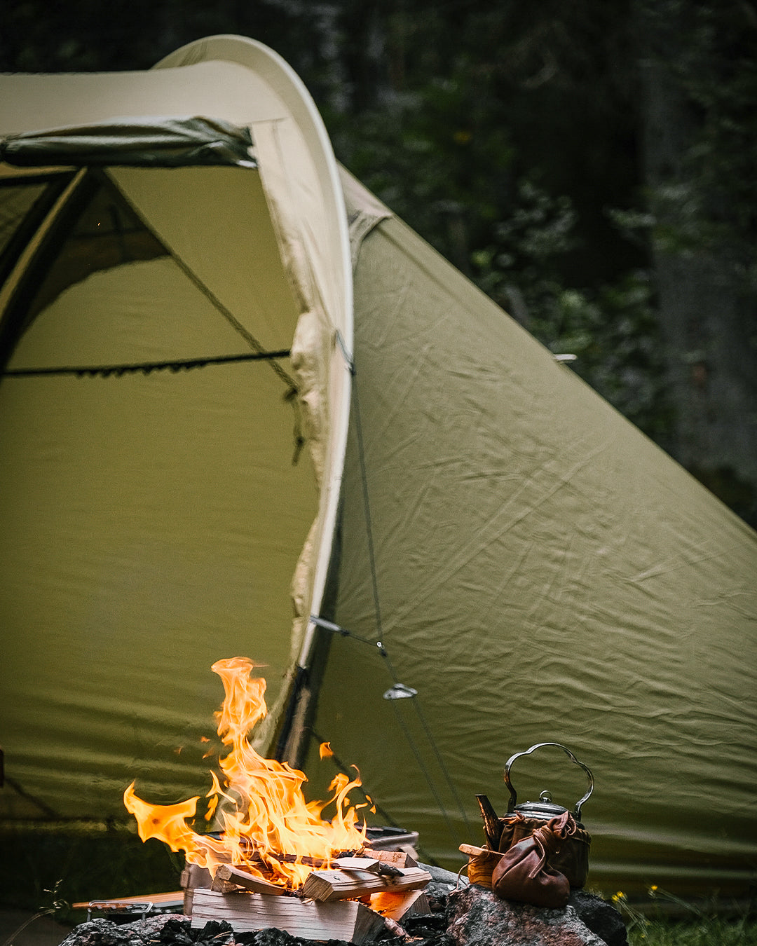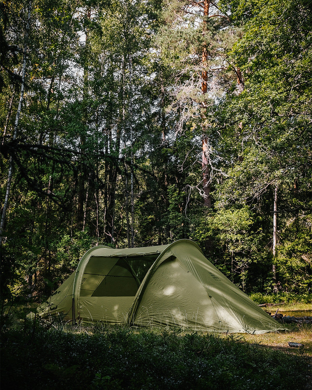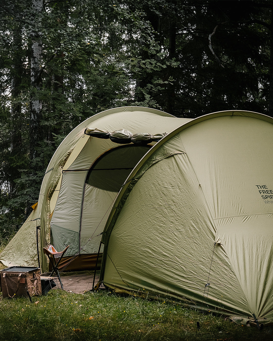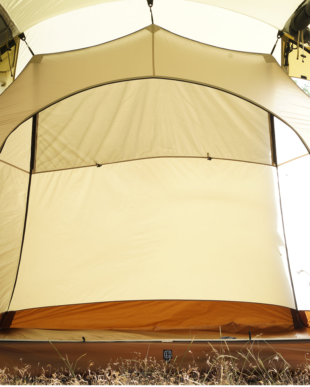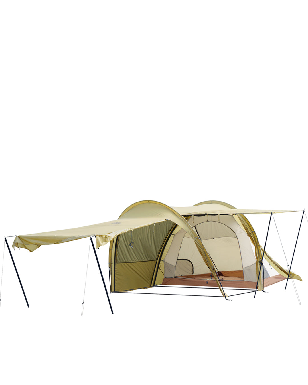 Large tunnel tent for family backcountry camping. It features multiple setup options for various of weather and usage. Outer tent has 8 zippers for 4 doors in 4 directions. It includes a 4 person inner tent and over 120 sq.ft of the vestibule.