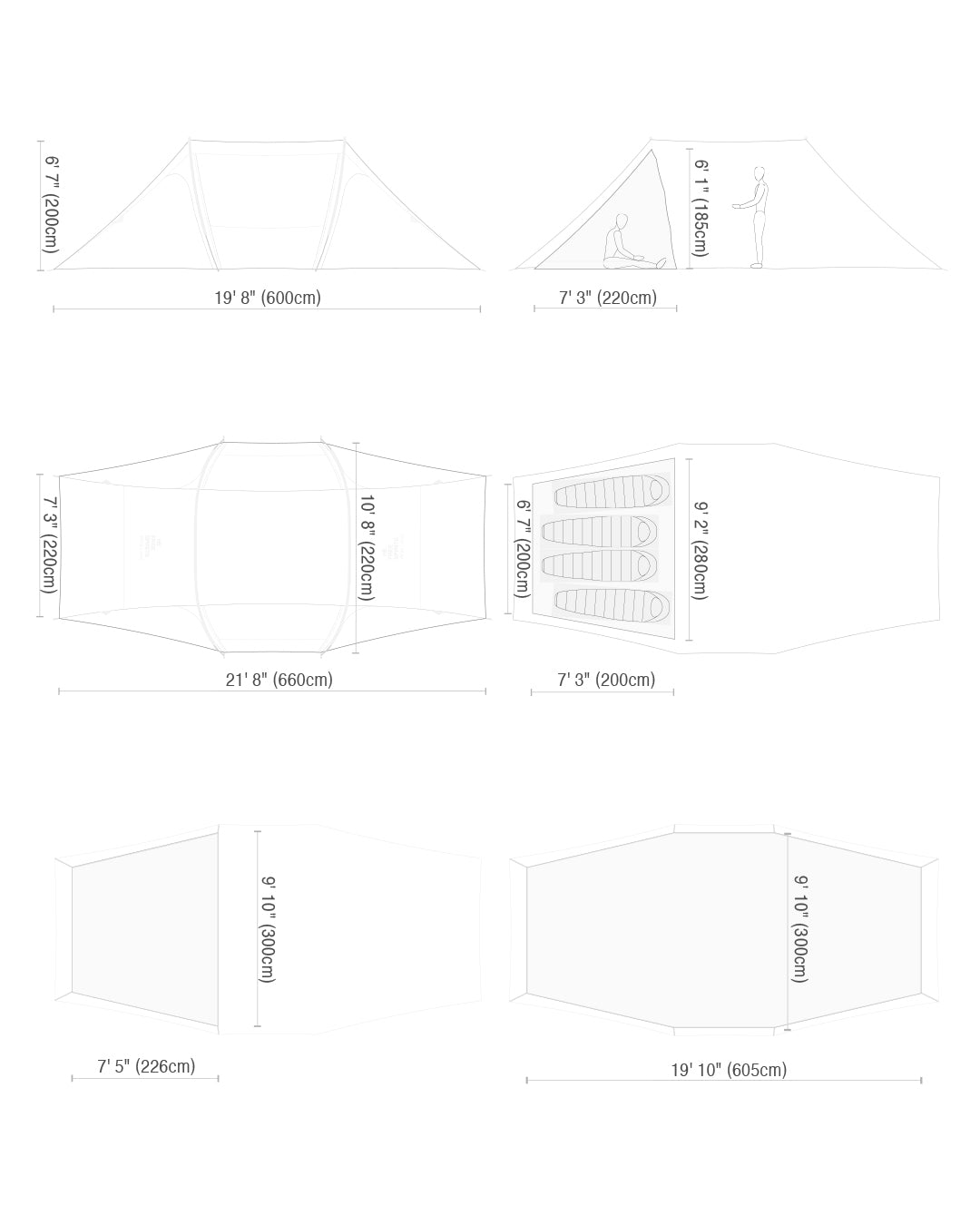 - Rainfly Size: Length: 21’8” (660cm); Width: 10’8” (325cm); Height: 6’7” (200cm)