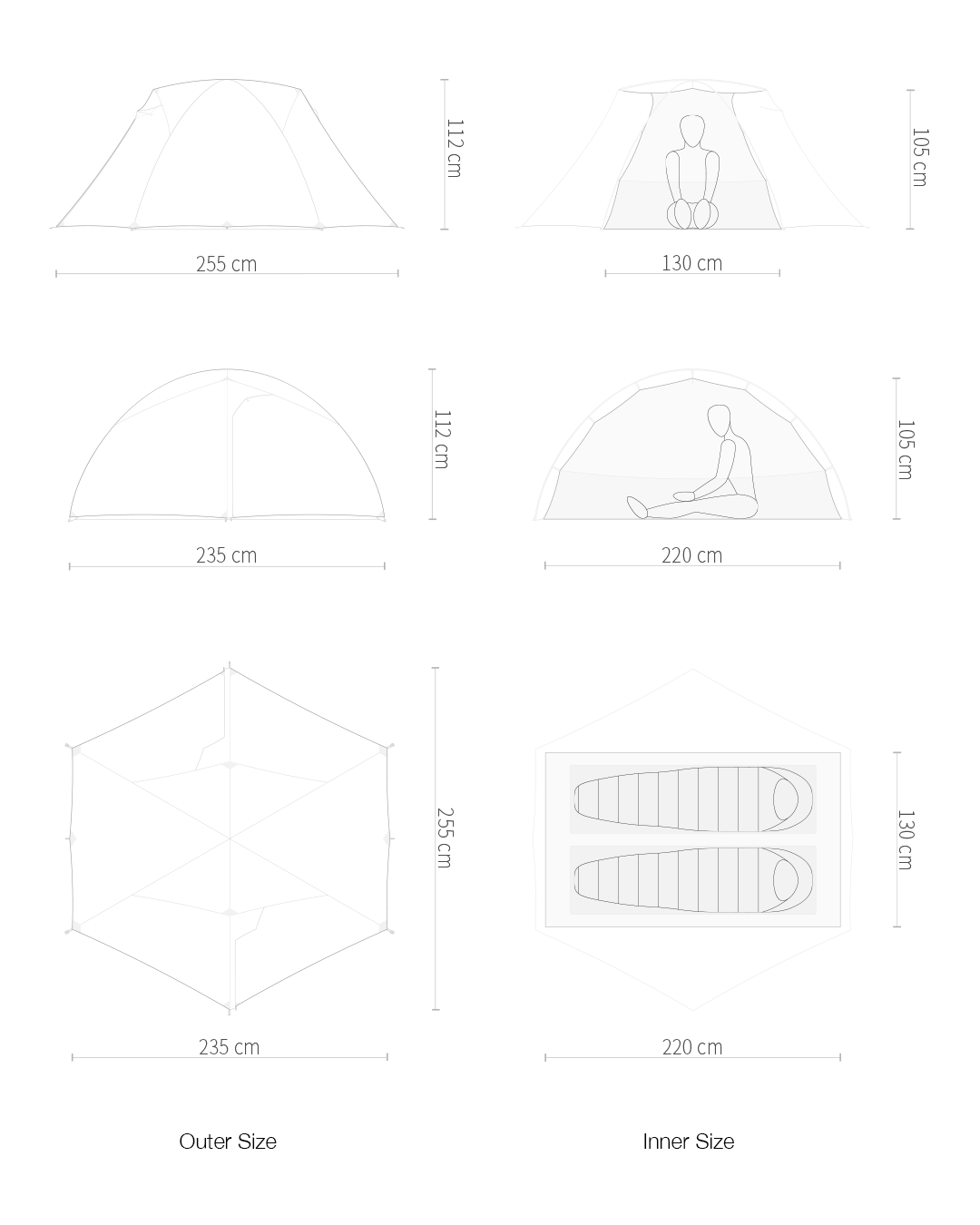 - Inner Size: Length: 7’3” (220cm); Width: 4’3” (130cm); Height: 3’5” (105cm)