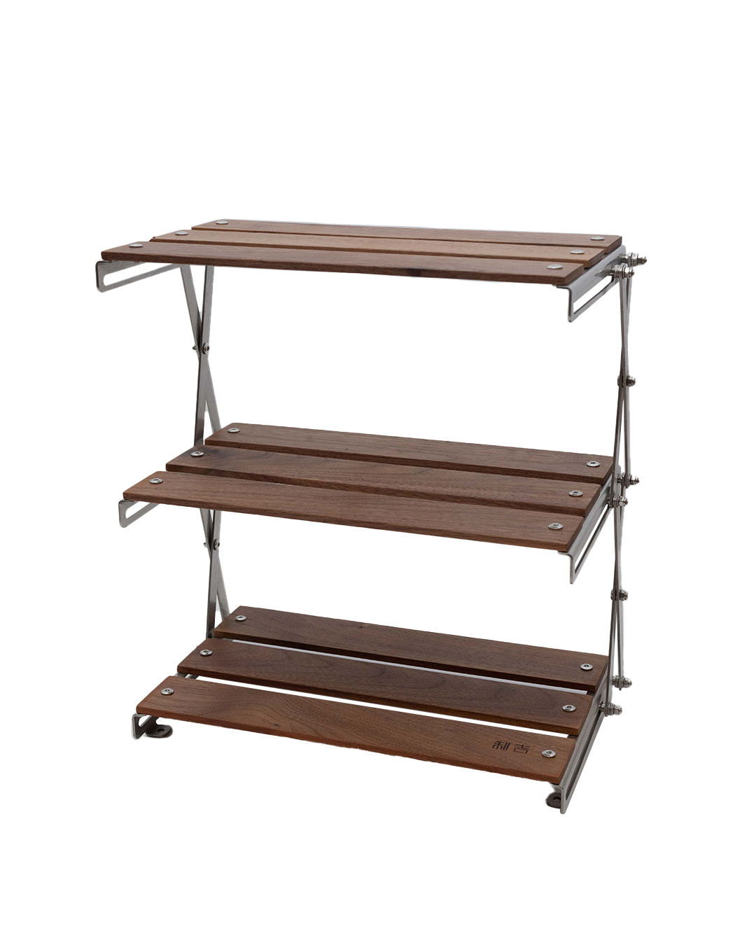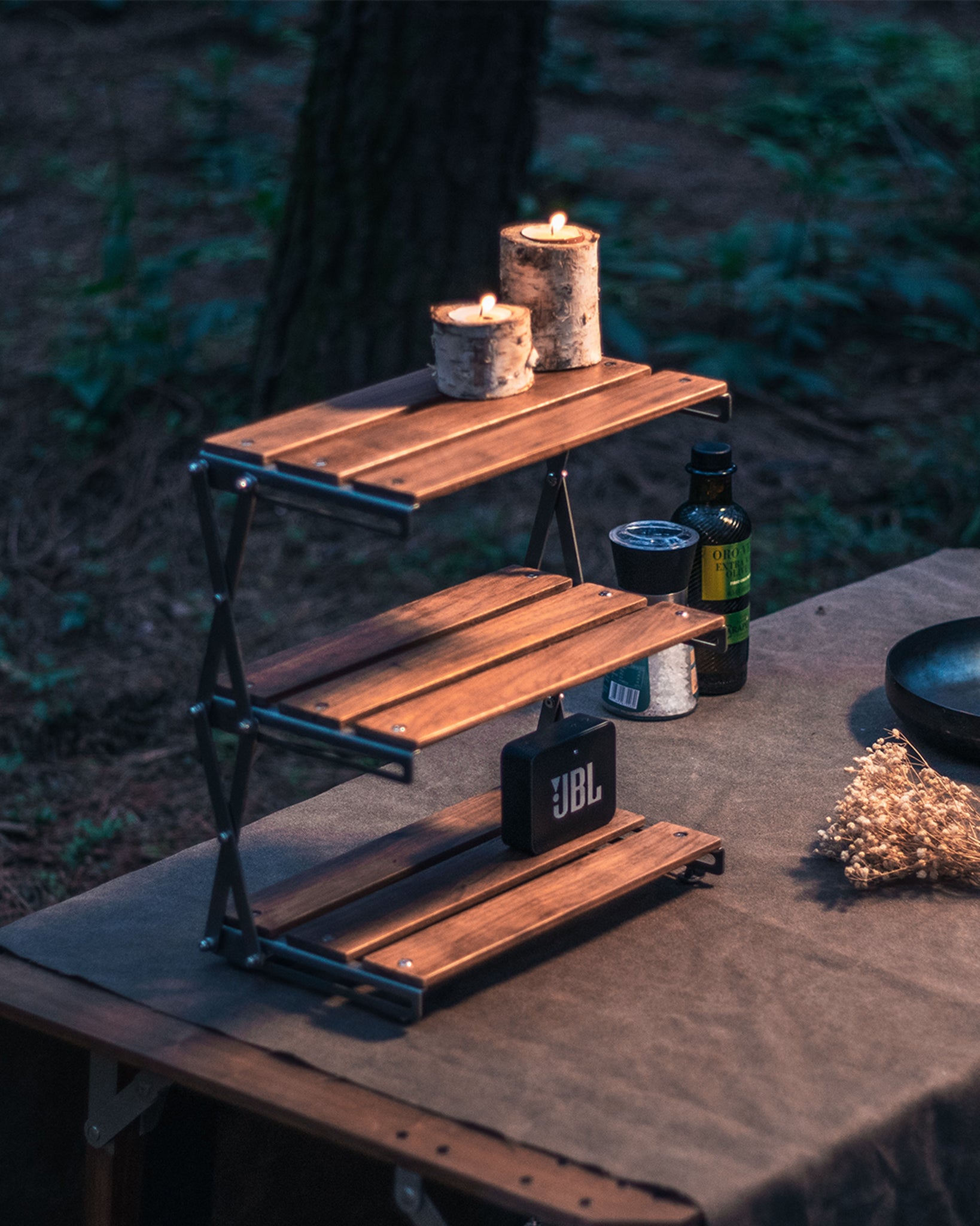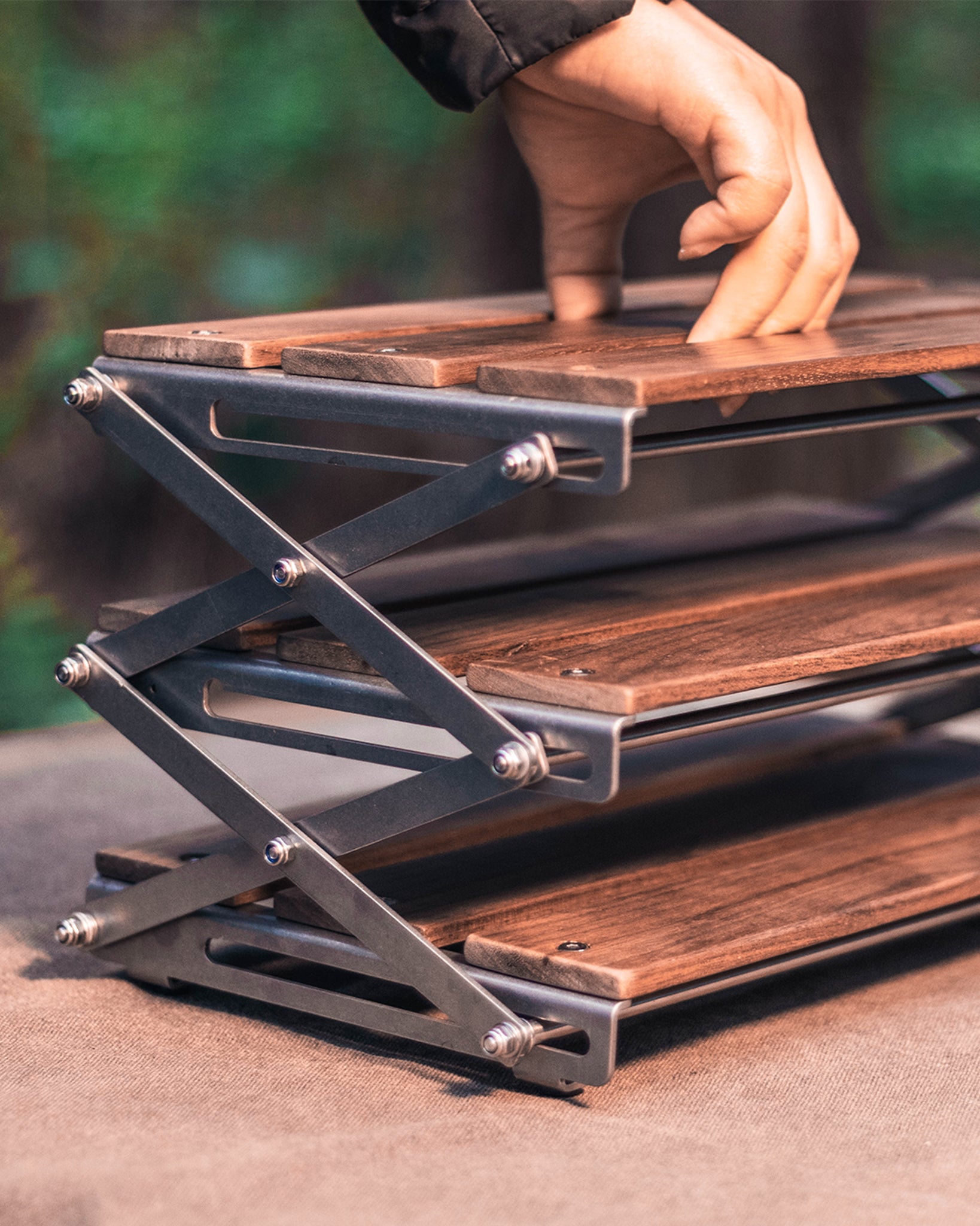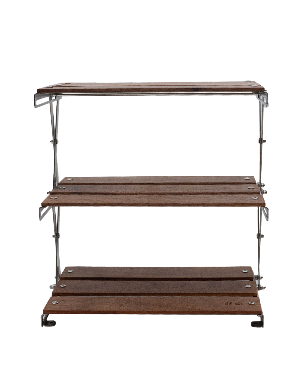 The Very Made Outdoor 3-Tier Quick Folding Shelf artfully blends walnut wood and stainless steel into a sleek, space-saving design. This delicate yet sturdy shelf features three tiers and allows for quick opening and folding, making it ideal for on-the-go storage during camping trips or for organizing small items. It is equipped with anti-slip rubber pads on the bottom to enhance stability.